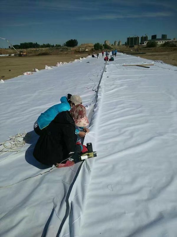 鋪設(shè)現(xiàn)場(chǎng)進(jìn)入人員不得穿釘芏、高跟鞋及硬底鞋,開始做業(yè)后,嚴(yán)禁在可能危害土工膜的范圍內(nèi)進(jìn)行交叉作業(yè),同時(shí)避免火源。具體施工中應(yīng)該注意以下幾點(diǎn):清除鋪設(shè)范圍支持層的各種錐形、尖棱雜物;每天土工膜展開的數(shù)量不得超過焊接范圍;鋪設(shè)時(shí)應(yīng)該考慮到材料的熱脹冷縮導(dǎo)致的尺寸變化,預(yù)留出一定的伸縮量,且應(yīng)避開夏季中午高溫時(shí)段。所有外露的土工膜邊緣須用砂舊輪胎等物壓載物壓覆,避免被風(fēng)吹起;